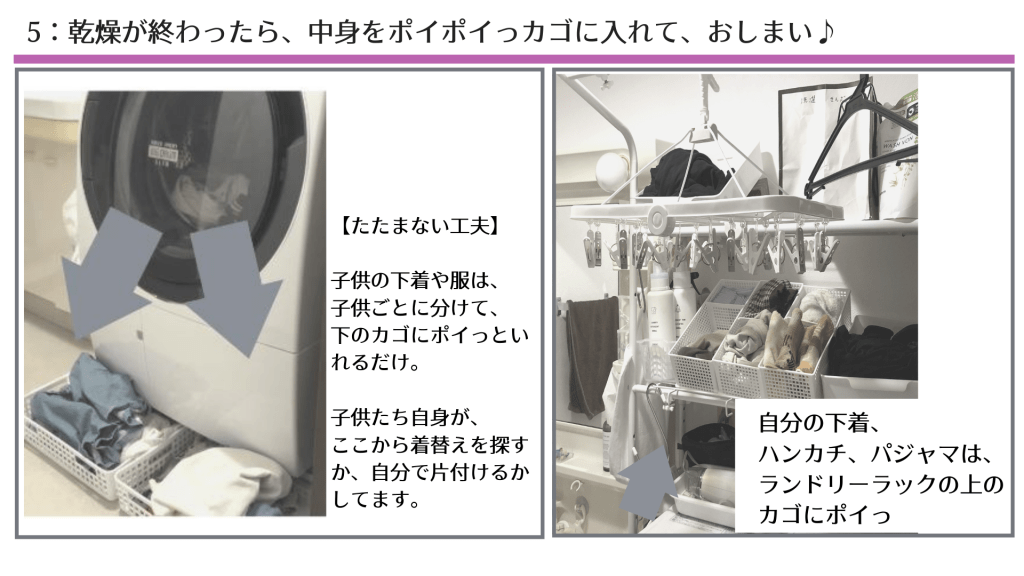 - 乾燥した洗濯物はたたまない。個人のカゴにポイっと入れるだけ(後は子供が自分で管理)。